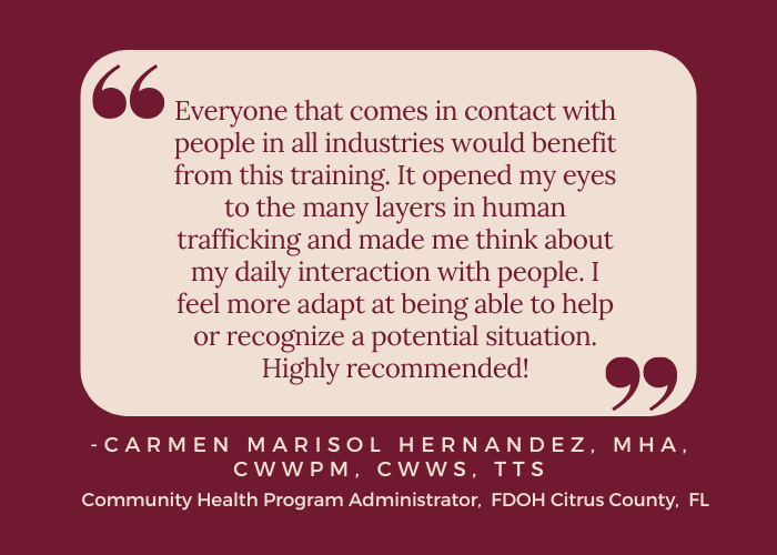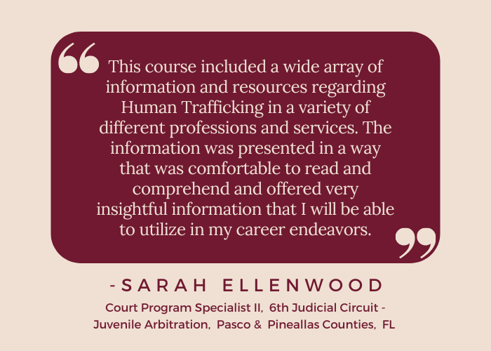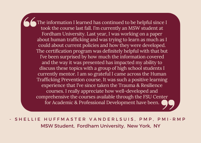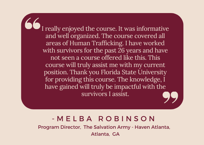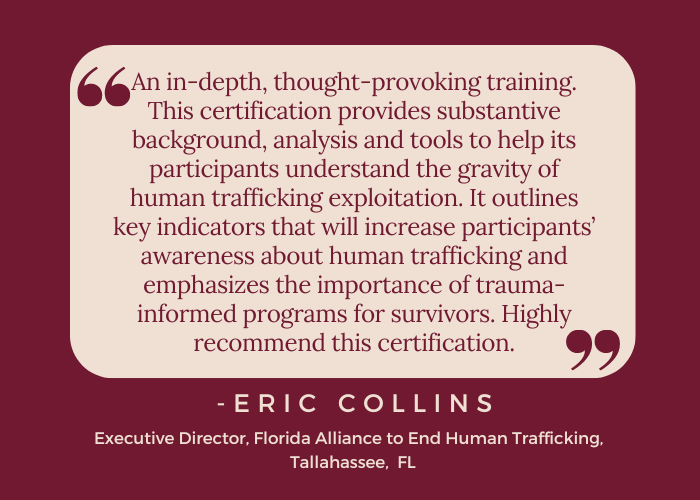 Florida State University offers an online curriculum for a Professional Certification in Human Trafficking Prevention & Intervention.