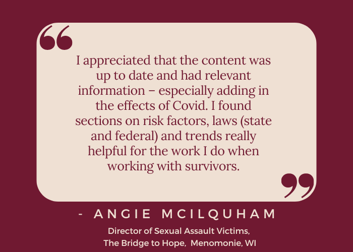 Our training is fully online and is self-paced. It includes 12 hours of course content and seven chapters of research-based readings, case scenarios, multi-media materials, assignments, and quizzes.