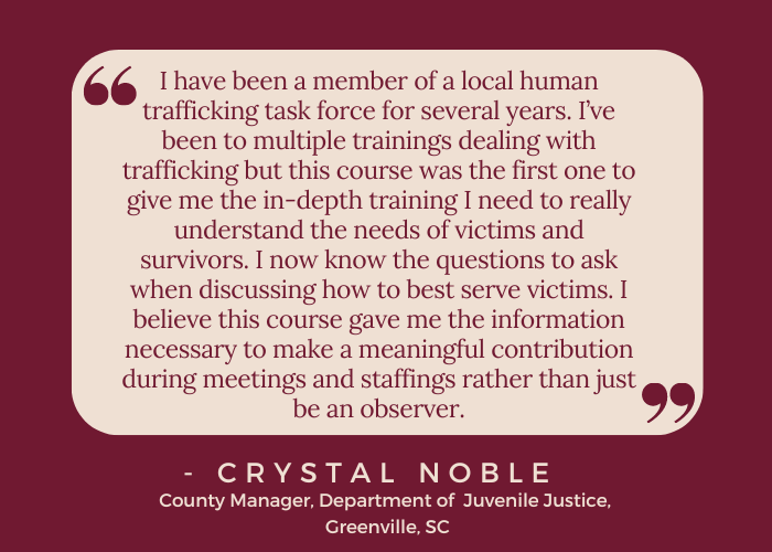 • Understand the effect of trauma on victim/survivors, preventing trafficking in vulnerable adults, and trauma-informed justice solutions.